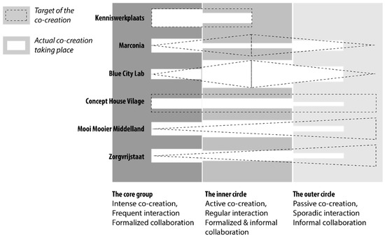 For all the ULLs taken into consideration, participation takes place in both formal and informal ways, but to different extends. We identify different forms of formal and informal co-creation between three types of groups involved: The core group, the inner circle, and the outer circle (from left to right in Figure 3). Within the core-group, which are mostly the initiators, co-creation is usually formalized and settled by legal responsibilities in relation to the particular Lab. Second is the ‘inner circle’, represented by the devoted people around the core-group, where semi-formalized forms of co-creation take place. For some of the Labs, the formal co-creation between the core group and the inner circle are at the core of their co-creation practices (Concept House Village, Kenniswerkplaats, Blue City Lab). People from the inner circle are selected and non-selected, but often formally invited by the core-group as users, experts, or entrepreneurs in different kind of settings, such as tenant, part of an advice group, or participants in a workshops (lead-users, as Von Hippel [60] would call them). The people who operate in the inner circle take an active role within the organization, but do not always have specific legal and formal responsibilities or direct influence on the Lab’s strategy. Third, there is the outer circle, with whom mostly informal co-creation takes place. This outer circle consists of people that are not strongly nor officially connected to the ULL. This informal co-creation often takes place when the core group tries to involve people from the ‘outer circle’, and to increase the participation of the outside community (Marconia, Blue City Lab) or between all three groups of people (Zorgvrijsaat, Mooi Mooier Middeland). These informal ways of co-creation take place when people visit the Labs (not necessary on a regular basis), when people participate in the open events organized by the Labs, or through people of different institutions that played a role in the rise or survival of the experiment. Co-creation in this form can be considered more passive. However, for many of the Labs, these events and the people that attend are crucial in expanding their ‘inner circle’ and forms of more formal co-creation (Marconia, Mooi Mooier Middelland, Zorgvrijstaat, Blue City Lab). However, the results also show that for some of the labs, the target and effort of the co-creation with the outer circle and the actual co-creation taking place with the outer circle was not matching (see Figure 3).