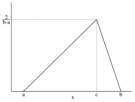 - assignment of the Probability Distribution Function (PDF) to each stochastic input variable, and the identification of the relative probability distribution parameters. As said before, the triangular distribution can be considered the most used PDF to represent the uncertain variables present in the real estate investments (Figure 1) [40,41,42]. Therefore, this step is devoted to the assignment of minimum, maximum, and point estimate values for each variable;