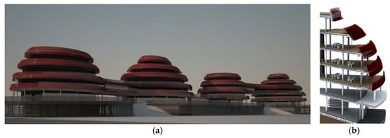 The case study: (a) the whole building project, named the Red Ring Office; (b) an isometric view of the building.
