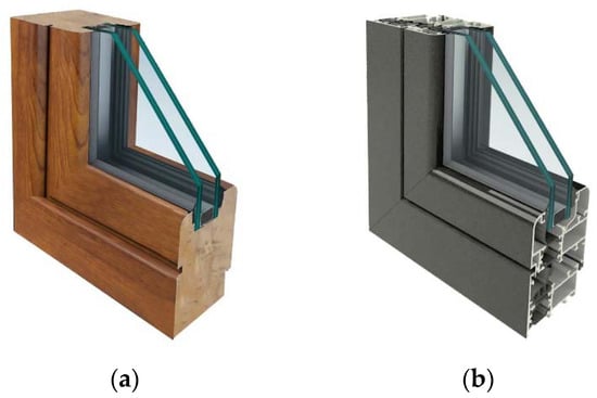 The glass façade is solved through two different technological solutions. In the first case, a timber frame window is adopted; in the second case, an aluminum frame window (see Figure 3) is adopted. Both of them have double selected low-emission glazing filled with argon (4 + 4/12 mm argon 90%/3 + 3). In particular, the two solutions have both the same value of window transmittance (Uw), which is lower than the limit value imposed by the regulations issued in Italy, especially in the force in the City of Turin [43,44].