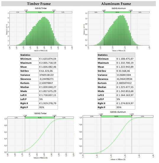 As illustrated in Figure 4, the first scenario presents the results considering the timber and aluminum frames for a 25-year lifespan. Comparing the probability distribution function of the GGcEnEc, the related Probability Density Function, and the statistics calculated for the two alternative frames, higher costs emerge for the timber frame, as expected from being in the presence of higher initial and periodic maintenance cost amounts.