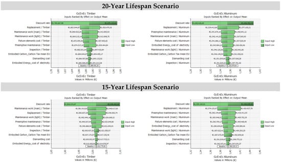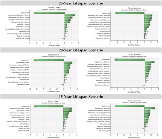 Analogously, the simulations are produced for the 20-year and 15-year scenarios, considering both timber and aluminum frames. The results of the simulations are synthetically reported in Figure 5 and Figure 6, in which the tornado graphs related to the effects of the inputs on the output mean and related to the Spearman correlation coefficients to determine the correlation between the global cost and the samples for each input distribution are illustrated.