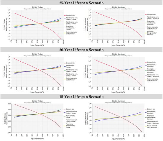 In fact, the residual value assumes a higher significance in the case of timber, while for aluminum, the effect in terms of the global cost is lower or more stable. In the case of a lower or absent residual value for timber frame, the global cost increases considerably: timber seems more reactive to the residual value reduction, as the timber component is more expensive. On the contrary, the aluminum component scenario seems less reactive to residual value variations.
