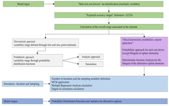In the application proposed in this work, the input definition phase follows a different workflow. The first two steps are developed in the same modality, while step three is solved through a “mixed deterministic–probabilistic conjoint application”. The probabilistic approach is proposed for defining every variable (cost item), with the exception of the lifespan of the alternative option elements. The latter is modeled according to the deterministic scenario analysis.