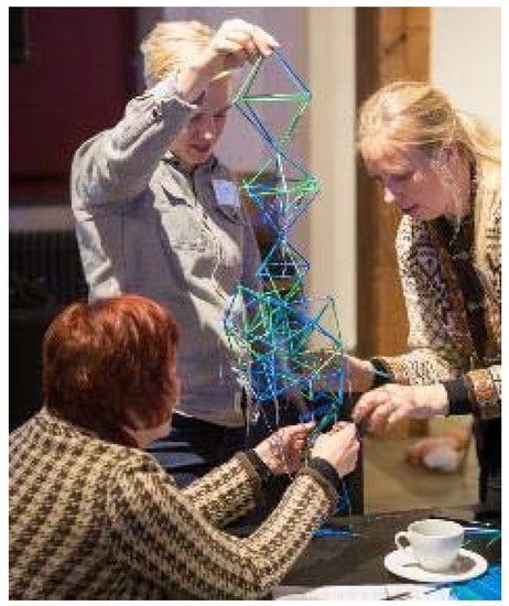 With regard to the first case in the study, the so-called “himmeli” is a traditional Finnish decorative mobile. It is made from short strips of rye straw tied together with string form a complex and symmetrical three-dimensional structure. It is used as a Christmas decoration that is hung over dining tables in many Finnish homes. What is less known is that the himmeli is thought to originate from a canopy decoration used in Medieval and Renaissance festivities in Central Europe. The word ‘himmeli’ has its roots in the Swedish and the German languages; himmel means sky and heaven. Maria Huhmarniemi began creating himmeli sculptures by extending traditional decorations (Figure 1). She learnt to make traditional straw decorations from her mother and morphed these symmetric forms into free and wild sculptures by using coloured plastic drinking straws, as well as the traditional natural straws. She has created several series of himmeli sculptures that bear a political message; the himmeli sculptures have Swedish and German names underlying the fact that art develops in interaction with other cultures. She has also organised workshops and tutored participants to build himmelis together. Some of the workshops have been cross-generational, with young, middle-aged, and elderly participants; others have been intercultural, attended by participants from diverse cultural backgrounds (Figure 2 and Figure 3).