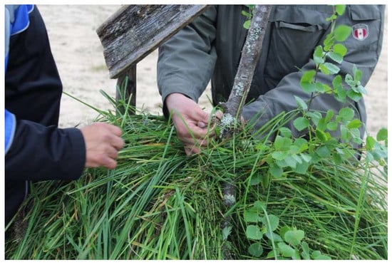 The second case study pertains to the traditional ways of using natural materials and turning them into contemporary art. For some years, Elina Härkönen has worked with several mixed village communities and intercultural groups in northern Finland. In the community-based art working they have used different natural materials varying from traditional haymaking (Figure 4) and willow sculpting to wool-dyeing processes with wild plants. Härkönen is interested in art as a community and participatory practice due to its dialogic nature and the involved intercultural encounters while working with traditional handcraft methods. When people come together and work with their hands, conversations flow more freely, and place-related matters and memories rise to the surface. The old communities hold a great deal of tacit knowledge about natural materials that often emerges in intercultural and intergenerational collaboration. The old Sami and other northern communities have utilized nature plants for different everyday purposes throughout the history but the older generations’ ability to ‘read’ the nature is threatening to disappear []. Knowledge is no longer passed to younger generations due to the changed urbanized living habits.