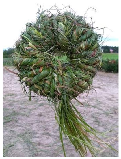 One example of a tradition that is no longer part of everyday life is the use of wetland sedges as shoe grass to insulate the traditional Sami fur shoes. Although traditionally from Sami origin, the shoe grasses have been utilized also within other communities living in the Arctic region dating back in the 20th century. Due to its versatile qualities, it has been a necessity both in winter and in summer. Instead of wearing socks, the dry grass is tucked inside the shoes to keep feet warm and dry. For storage purposes, the cut and softened hay is spun and twisted into a ball, known as a ‘fiera’ [] (Figure 5).