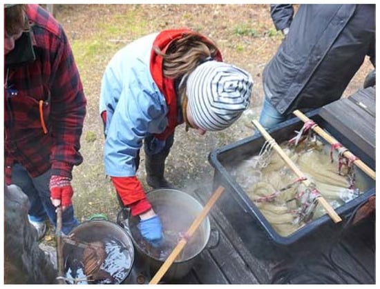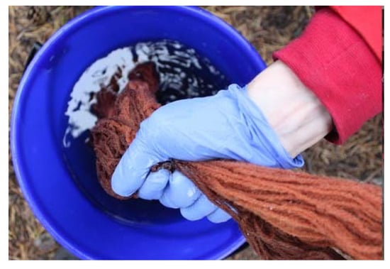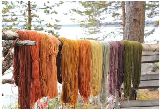 Use of natural dyes is a universal tradition and has long roots in Finland as well. A special feature in the Finnish tradition is to collect plants from nature and use them fresh, in contrast to the general European system of using dried materials for dyeing []. The collection of wild plants from nature follows the special Finnish legal concept of ‘every man’s right’ that allows anyone to pick wild berries, mushrooms, and flowers, as long as they are not protected species []. Currently, dyeing with natural materials is a skill that mainly enthusiasts maintain. In the autumn of 2017, Härkönen organized a dyeing workshop for local women in Lapland (Figure 6 and Figure 7). The women were of different generations and had various relationships with handcrafts. The workshop aimed for participants to experiment with different dyes and become familiar with the traditional natural dyeing methods. Each dyed material resulted in a form of artwork, but its form was not decided before seeing the results. In the workshop, Härkönen was interested in the conversations that arose when working by hand. One of the women was a craft artisan by profession and experienced in natural dyes. The other women brought their knowledge of plants and wool, and their skills were shared throughout the process. The spectrum of colours equally surprised everyone; none of the women had expected such variety (Figure 8). Subsequently, Härkönen continued her analysis by working on the yarn to create an artwork that was exhibited in 2018 (Figure 9).