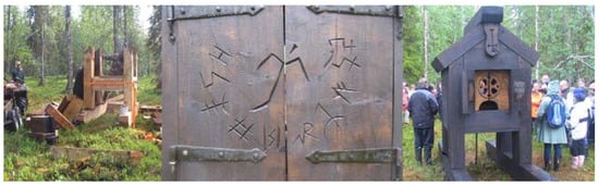 Concerning the third case study, Timo Jokela grew up in a small village in Lapland. When he was young, he helped his father to build traditional wooden boats and learnt a variety of traditional skills that were vanishing from their community. He has used several traditional ways of crafting and has noticed that new meanings become associated with traditional materials and tools. Hence, he started to combine traditional, non-artistic working methods with contemporary art in installations and public art. One of his works is a memorial to an old church that is claimed to have been built in the early 1600s, in a low forest called Kirkkokuusikko (Spruces Church) in the hinterland of Kittilä, northern Finland. His grandfather used to call the forest by that name. The story of the church in the forest was thought to be all true by the village people over several generations, but the exact location of the church was unknown. Jokela designed the memorial and searched the literary and archival sources for evidence of the veracity of the Spruces Church story. He built the replica first in his studio and then dismantled it, transported its parts to the site, and re-erected it there. The site is located in the middle of a swamp, several kilometers from the nearest road. The transport alone required the assistance of local reindeer herders. The transport, assembly, and celebration (Figure 10) of the work was a performative and communal event. The Jokela Family Association, which commissioned the work, hoped that the memorial would generate debate about what and who would be remembered or forgotten, what would be worth reminiscing about, and who could recall the history of Lapland [].