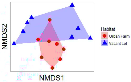 Non-metric multidimensional scaling ordination of the community composition of bees collected from urban farm and vacant lot greenspaces. Stress of the final configuration was acceptable (stress = 0.19) and the ordination was plotted in two dimensions.