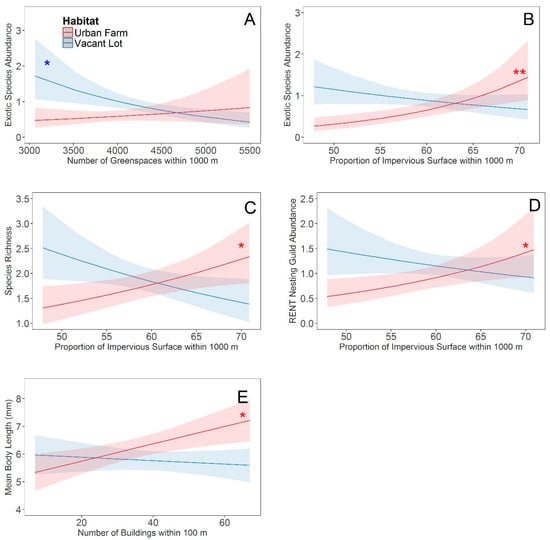Habitat specific effects of landscape variables. Relationship between exotic bee abundance and (A) the number of greenspace patches, or (B) the proportion of impervious surface within 1000 m of a focal site. Relationship between (C) bee species richness and the proportion of impervious surface within 1000 m of a focal site, (D) the abundance of the RENT nesting guild and the proportion of impervious surface within 1000 m of a focal site, and (E) the mean body length and the number of buildings within a 100 m radius. Best fit lines (±95% confidence interval) for urban farms are represented in red and vacant lots are represented in blue. An asterisk next to the best fit line indicates that the slope of that line is significantly (* p < 0.05; ** p < 0.01) different from zero.