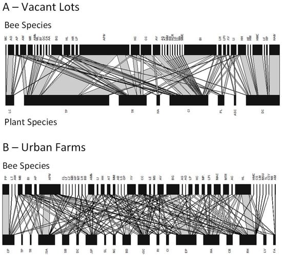 Quantitative plant-pollinator networks in (A) vacant lots and (B) urban farms. Pollinators are represented along the top, plants along the bottom. Each species is represented by a black rectangle, and the width of that rectangle illustrates that relative frequency that a particular species interacts with a member of the opposite trophic level. A list of the full species names is provided in Appendix A: Table A1 and Table A2.
