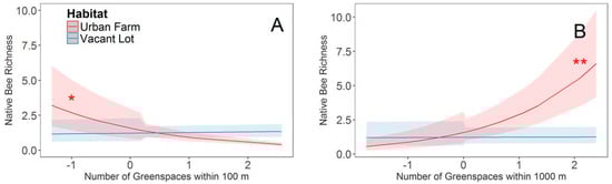 Habitat specific relationship between native species richness and the number of greenspaces within (A) 100 m and (B) 1000 m radii. Predictor variables were scaled to ensure model convergence. Best fit lines (±95% confidence interval) for urban farms are represented in red and vacant lots are represented in blue. An asterisk next to the best fit line indicates that the slope of that line is significantly (* p < 0.05; ** p < 0.01) different from zero.
