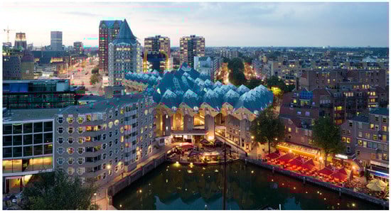 Until 1940 the centre was a bustling city. However, after 1945 it was characterised by functionality. The bombing of 1940 unwillingly led to the fulfilment of another cherished desire, which was to become a new modern city. A complete new centre with modern architecture was introduced. However, this was accompanied by an almost anti-urban experiment with the separation of functions, based on a typical model of society at that time: the city as a sum of separate functional clusters, which had nothing to do with each other. As a result, new housing was not part of the inner city and was planned outside the city in one of the new-green-neighbourhoods. Essential for the city was also the vibrant, cultural (night) life that was gone. It turned out that the new ‘functionalism’ approach did not offer a good breeding ground for this. In the 1970s and 1980s, the gloss of modernity, so typical of the period of reconstruction after the war, was gone. The ever so modern Lijnbaan shopping mall in the centre of the city had become outdated. There were large bare spots in the city centre and in the evening the streets were deserted. Since 1985, more housing has been planned in the inner city area. The famous cube houses of Piet Blom were built in those days (Figure 1).