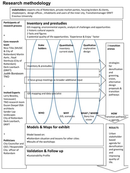 Work on a liveable low carbon city has often been approached in a technocratic way, not linking to other disciplines and urban practices at a large scale. This paper explores a stakeholder based urban agenda for a more liveable low carbon city by densifying and greening with the case study of Rotterdam inner city. Rotterdam presents a unique European case with a modernistic inner city. Like many North American cities, the inner city for a long time mainly served as a business or shopping district with few inhabitants and few synergetic links between flows, urban functions, and areas. In line with other cities, Rotterdam aims to reduce carbon emissions and provide a high quality of life. To address this, the hypothesis ‘densifying and greening leads to a more sustainable inner city’, was tested and applied with stakeholders using transition management combined with urban data, modelling, and design. With sustainability indicators, geographic information system (GIS) mapping, and urban models, a baseline study was completed and expected outcomes were described and, where possible, validated in reality. The outcomes confirmed the stated hypothesis and showed that linking design, GIS mapping, and city data to transition management proved successful.