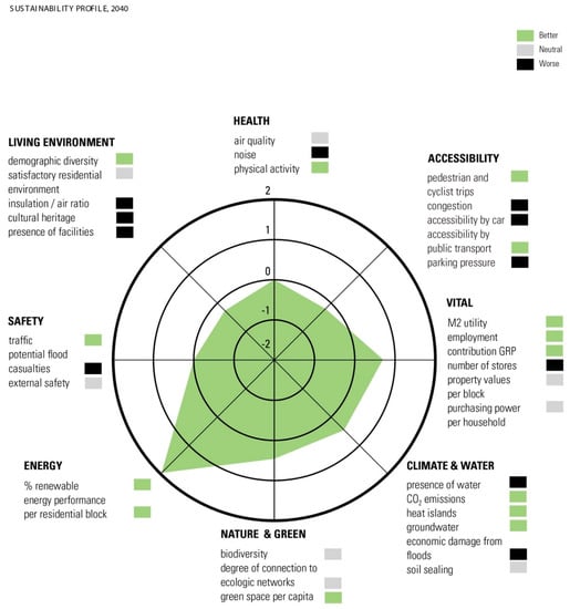 The selection of indicators was based on priority issues formulated by the city, their relation with urban densification, and on the availability of data. Subsequently, a baseline of the Sustainability Profile was set for these themes in the inner city. Following this, the densification strategies and designs were imported into the model Urban strategy [18] and GIS; the values of the 35 indicators were calculated for 2040 or for the moment the proposed densification and greening is completed. To assess the impact of the proposed densification, the outcomes were interpreted qualitatively by visual comparison, and quantitatively by summarising results and making additional calculations. After that, the values of the individual indicators were combined for all distinguished themes. The outcomes were presented in a spider diagram which was called The Sustainability Profile.