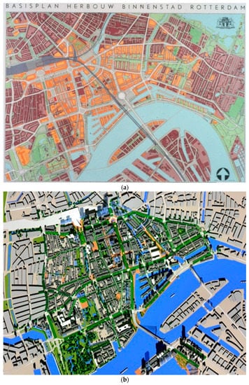 (a) Reconstruction plan after World War II (courtesy City of Rotterdam). (b) Green densified inner-city plan as the built vision: city as a forest (image by Doepel Strijkers Architects, Rotterdam). This new vision gives a more central role to greening strategies.