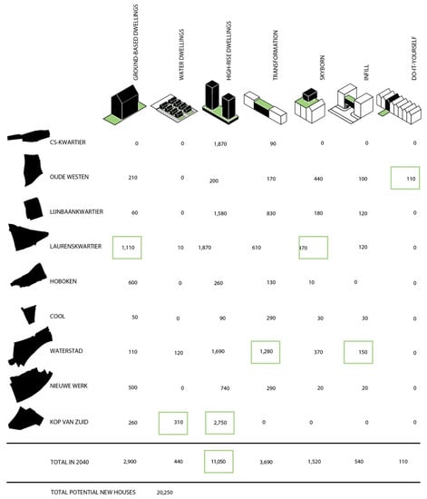 For this research, seven densification strategies, which were identified during the stakeholder sessions, have been explored in terms of their spatial potentials. The ambition of this exploration is not to generate a master plan for densification of the nine neighbourhoods in the inner city (Figure 5); rather, the intention is to demonstrate that there is more available space in the inner city than one may think, and that, in theory, doubling the number of inner-city inhabitants is spatially realistic without diminishing the existing quality of life. To use realistic data for this research on densification, housing typologies characteristic for certain areas in Rotterdam were used. People tend to live were other people of their own peer group live. An example is that people with children want to live where already other people with children are living [24]. So, the strategy was to start with successful areas which were already present. Below in Figure 6, the densification strategies are listed in a matrix. For each strategy, the number of potential units are listed per neighbourhood in the inner city district.