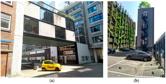 (a) Mauritsstraat, Cool, infill densification strategy, by Kühne en Co. (Rotterdam, The Netherlands); (b) Boomgaardstraat, Cool, Kühne en Co. (photos by Nico Tillie).