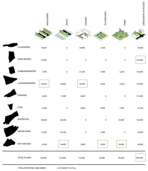 The city’s wish to attract more inhabitants and visitors to its city centre will only work if the city offers a pleasant living environment that develops along with the densification. The public realm plays an important role in this. Research has shown that an attractive public realm, one in which green amenities are the essence, is an important prerequisite for city life, in terms of day-to-day living and for the work and leisure environment [25]. The more attractive this public realm, the more people would like to spend time there. In this research hypothesis, 5000 new trees should be added and along with other green covering will cover a total area of 150 football pitches (90 ha).