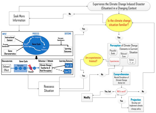 The goal of this paper is to propose policy recommendations to support the implementation of the Paris commitments and contribute to combating GHG emissions and the climate change governance problem. We propose working with policymakers through introducing the unfamiliar world of climate change to enhance their situation awareness (SA) with the aim of changing their perceptions, attitudes, and behaviors, leading to action. We assess whether increased situation awareness through the introduction of the unfamiliar climate change effects to policymakers may lead to action. We adopt the Endsley (1995) definition of situation awareness as “the perception of the elements in the environment […], the comprehension of their meaning and the projection of their status in the near future” [22]. According to Endlsley (1995), there are three levels of SA: level one is perception, level two is comprehension, and the final level is projection. Increased situation awareness depends on the success of level 1 (perception), coupled with comprehension and projection of the change in awareness [22,23,24]. On the other hand, studies also confirm that the level 1 (perception) of SA is influenced by comprehension and projection [24,25]. Thus, there is a strong linkage between the three levels, and the relationship is not simple nor linear. Bartel (2016) explains that team SA is “the degree to which every team member possesses the situation awareness required for her or his responsibilities” [24] (p. 68).
