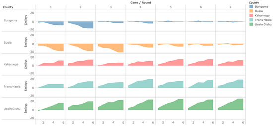 There are several SA measurement techniques, including SART [54]. In the Nzoia WeShareIt game, we used three SA measurement techniques: subjective rating measures (SART) pre-test and post-test questionnaires, performance measures and embedded task measures that were inbuilt in the game [16,26,55]. Endsley (1995) highlights objectivity and less intrusion as critical advantages of performance measures over self-rating subjective techniques. The players did not realize that they were being assessed because the performance matrices were inbuilt in the digital game. Performance measures model a more realistic environment. In addition, performance measures helped in checking the reliability of the subjective SART scores [56]. Another type of performance measurement that was inbuilt in the Nzoia WeShareIt game was external task measures. Sarter and Woods (1991) explain that external task measures entail altering the information and, thereafter, measuring the time taken to react to this change [57]. This measurement technique was introduced in the Nzoia WeShareIt game through a drought round that leads to significant reduction in resources. Endsley (1995) cautions that the technique may be based on wrong assumptions and is highly intrusive. We incorporated this technique because we strategically intended to intrude and alter ongoing tasks and plans thereby disrupting normality with the aim of increasing situation awareness. Team and cross team SA was not included in the design and measurement of the policy game [56]. The Nzoia WeShareIt game also uses the embedded task measures technique to measure situation awareness. The inbuilt electronic game automatically calculated how much trading is done by each participant and what they buy and sell. Also, there is information on how much each player spends on buying food, hydro-electric power, solar power, investing in public services and the payment of penalties. This information can be used to measure many aspects of preferences, strategies, goals and situation awareness levels. The challenge we faced while using the data collected from this technique was the interconnectedness of many factors, that may lead to misleading results. To address this, we used many research techniques to triangulate and confirm the results.