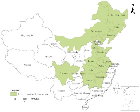 The main grain-producing areas are important production bases for China’s commodity grains (see Figure 1). Compared with non-main grain-producing areas, these areas have conditions such as a soil, climate, and geography location that are more suitable for planting food crops, have high grain yields and have a relatively large proportion of plantations. In addition, these areas satisfy their own consumption, and a large amount of the economically valuable area can also be utilized for commodity grains [42]. According to the “Opinions on Reforming and Improving Several Policies and Measures for Comprehensive Agricultural Development” promulgated by the Ministry of Finance in 2013, the areas includes the following: Heilongjiang, Jilin and Liaoning in Northeast China; Hebei, Inner Mongolia in North China Area; Shandong, Jiangsu and Anhui in East China Area; and Henan, Hunan, Hubei and Jiangxi in Central China Area. In addition, in the Southwest China Area of Sichuan, a total of 13 provinces were identified as the main grain-producing areas of China [43]. According to the data published in “China Statistical Yearbook 2017”, the area of cultivated land in the main grain-producing areas in 2016 was 88.926 million hectares, representing 65.9% of the country’s cultivated area; the effective irrigated area was 46.111 million hectares, representing 69.6% of the country’s effective irrigated area. The grain output was 47.677 million tons, representing 75.9% of the country’s total grain output. From the perspective of grain sales, farmers in grain production areas in China represent more than 80% of the nation’s total grain sales [44]. Most of the 13 main grain-producing areas are in plain or lowland areas, with humid or semi-humid climates, adequate light, abundant moisture, fertile soil and high organic matter content; these characteristics are suitable for farming and the conservation of soil and water and suitable for the growth of crops [45,46]. The main grain-producing areas have a very close relationship with food security. The main grain-producing areas are responsible for ensuring national food security. To maintain national food security and economic stability, we must focus greatly on the cultivated land use efficiency in the main grain-producing areas [47].