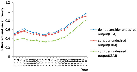 Relying on the Maxdea7 software platform, based on the DEA, EBM, and SBM super efficiency models, the cultivated land use efficiency values in the main grain-producing areas from 1993 to 2016 were calculated. The DEA super efficiency model calculates the cultivated land use efficiency value without considering the undesired output. The calculation of the EBM and SBM super efficiency models is to consider the cultivated land use efficiency value under undesired output. From Figure 2 and Table 4, it can be observed that the average cultivated land use efficiency in the main grain-producing areas was significantly reduced after considering undesired output. Using the period from 2014 to 2016 as an example, the average efficiency of the undesired output was 0.876, which is the opposite of 0.915. It can be observed that, considering that the undesired output has a significant impact on the measurement of cultivated land use efficiency, the model of high input, high output, and high efficiency is unscientific, and the efficiency evaluation based on undesired output can improve its accuracy and credibility. However, SBM models that also consider undesired outcomes tend to underestimate the efficiency of Decision Making Unit (DMU), because they ignore the linear proportional information. The DEA method deals with the input and output data of all decision-making units (DMUs) to construct a frontier efficiency surface. If DMU's efficiency value is 1, it indicates that the DMU’s input-output combination efficiency is optimal. If the DMU's efficiency value is between 0 and 1, it indicates that the DMU input-output combination is efficient but not optimal. If the DMU's efficiency value is 0, it is an inefficient DMU. The EBM model is a mixed model that includes both radial and SBM model distance functions and can reflect the cultivated land use efficiency more realistically. At the same time, the mean values calculated by the DEA super efficiency model and the SBM super efficiency model are 0.633 and 0.452, respectively. The efficiency value calculated by the EBM super efficiency model is 0.600, which is exactly between the DEA super efficiency model and the SBM super efficiency model.
