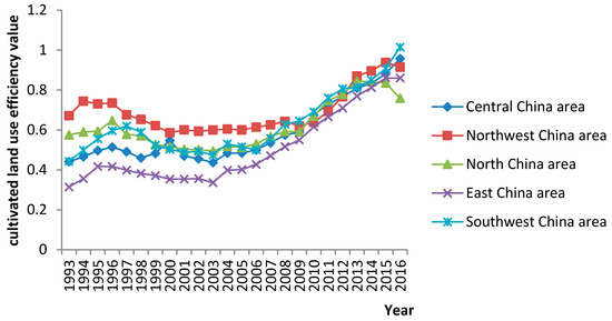 On the regional level, this paper divides the main grain-producing area into five regions: Northeast China (Heilongjiang, Jilin, Liaoning), North China Area (Hebei, Inner Mongolia), East China Area (Shandong, Jiangsu, Anhui), Central China Area (Henan, Hunan, Hubei, and Jiangxi) and Southwest China Area (Sichuan). The five regions all experienced the process of the shifting efficiency value from high to low and then to high again. The changes in the five regions were approximately the same, with an overall upward trend, with an average annual increase of 1.77%, 1.60%, 5.54%, and 3.77% and 3.55%, respectively. Additionally, there was a clear regional difference in the cultivated land use efficiency in the main grain-producing areas (Figure 3). The cultivated land use efficiency from 1993 to 2008 was gradually reduced from Northeast China, North China Area, Southwest China Area, Central China Area, and the East China Area. The average difference in cultivated land use efficiency in each region was maintained at 0.005–0.190. The cultivated land use efficiency in Northeast China was the highest in the five regions, with an average efficiency value of 0.693. In addition to the apparent downward trend in 1996–2000, the overall efficiency shows a progressive trend. The main reason is that the Northeast region has actively promoted the control and improvement of cultivation quality and widely promoted the return of crop stalks to fields. In addition, the management quality of cultivated land in Northeast China has increased significantly in recent years, particularly the cultivating rate, the planting rate, the yield, and the large-scale irrigation facilities. Great progress has been made, and the cultivated land use efficiency has been improved.