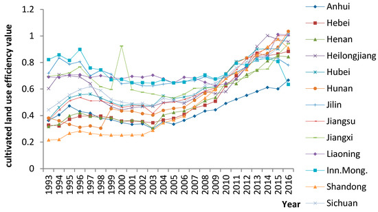 Temporal change of cultivated land use efficiency in various provinces under the constraints of carbon emissions and nonpoint source pollution in the major grain-producing areas from 1993 to 2016.