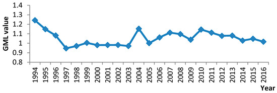Global Malmquist–Luenberger (GML) index of major grain-producing areas 1994–2016.