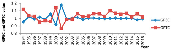 This paper used the GML index to measure the TFP of cultivated land use in 13 provinces of main grain-producing areas in China from 1994 to 2016, considering undesired outputs, and broke it down into GPTC, GSEC, GPEC, and GSTC to study the measurement results. The GML index is a method used to measure TFP of cultivated land. The index can not only deal with multi-output and multiple-input, as well as the undesired output of environmental pollution caused by production, but also can avoid the problem of linear programming without solution of the traditional ML index, which can be cumulatively accumulated. In turn, the TFP of cultivated land can be calculated more accurately. GPEC indicates the level of environmental governance in major grain-producing areas. GSEC indicates the scale of the economy in major grain-producing areas. The GPTC is a standard that distinguishes technical progress in various regions of the main grain-producing areas. The GSTC indicates the interactive relationship between economic scale and technological progress. The specific results are shown in Figure 5, Figure 6 and Figure 7.
