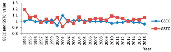 Changes of Global Scale Efficiency Change (GSEC) and Global Scale Technological Change (GSTC) under the constraints of carbon emissions and nonpoint source pollution in major grain-producing areas from 1993 to 2016.