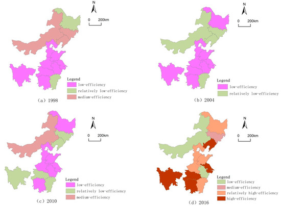 According to the calculation results of the EBM super efficiency model, and in accordance with the classification method of environmental technology efficiency by Tu [61], the cultivated land use efficiency in the main grain-producing areas is set to 0.6, 0.7, 0.8, and 0.9 as the classification threshold, and the efficiency value is (0, 0.6], (0.6, 0.7], (0.7, 0.8], (0.8, 0.9], and (0.9, 1.5]. The regions are divided into low-efficiency, relatively-low-efficiency, medium-efficiency, relatively-high-efficiency, and high-efficiency regions. Combined with the improvement quantities of carbon emissions and nonpoint source pollution in 13 provinces in the main grain-producing areas, the spatial differentiation characteristics of cultivated land use efficiency in the main grain-producing areas are analyzed as follows: