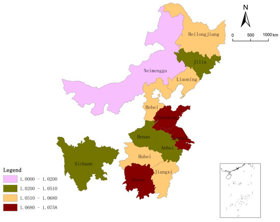 (2) From the perspective of spatial differentiation, the mean value of the GML index of the provinces in the main grain-producing areas from 1994 to 2016 was supported by ArcGIS 10.1 software. The natural discontinuous point classification method was used to determine the TFP of cultivated land use in the main grain-producing areas. The growth situation is divided into four categories: low (), relatively low (), medium (), and high (). It can be observed that the efficiency of the 13 provinces has generally improved. The high-grade regions are mainly distributed in Shandong, Jiangsu, and Hunan Province in the Central China Area. The middle-grade regions are mainly distributed in Heilongjiang and Liaoning in Northeast China, Hebei Province in the North China Area, and Hubei and Jiangxi Provinces in the Central China Area. The relatively low-grade regions mainly include Hunan Province in the Central China Area, Anhui Province in the East China Area and Sichuan Province in the Southwest China Area. The low-grade region is Inner Mongolia in the North China Area. Figure 9 shows that there is a serious regional imbalance in the distribution of the TFP of cultivated land use in the main grain-producing areas in China, and there is a “point-like” distribution trend in the distribution.