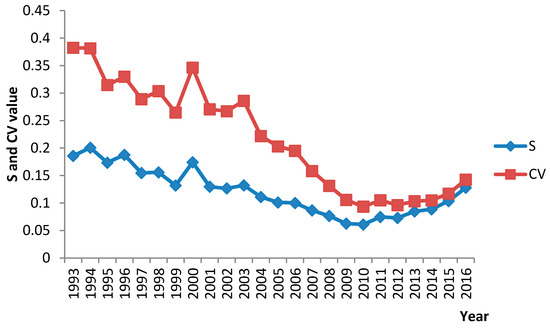 In the formula, represents the time period examined. represents the value of cultivated land use efficiency at the beginning of province in the main grain-producing areas. . represents the value of cultivated land-use efficiency at the end of province . in the main grain-producing areas.; is the interception term. is the estimated coefficient, and is the error item. If the estimated coefficient is negative and statistically significant, it means that the rate of increase in the cultivated land use efficiency is negatively correlated with the value of initial cultivated land use efficiency. The provinces with low cultivated land use efficiency are growing faster than those with high cultivated land use efficiency. Absolute -convergence exists. The result of the above -convergence is used as the basis for the time division. From Figure 10, it can be seen that 2000 and 2010 were the turning points of the standard deviation and coefficient of variation of cultivated land use efficiency. The authors regard 2000 and 2010 as the criteria for dividing the time period and divides the period from 1993–2016 into three time periods, considering the overall convergence of 1993–2016. Thus, this paper divides the absolute test of cultivated land use efficiency in the main grain-producing areas in China into four time periods: from 1993 to 2000 (based on 1993 as the base year), 2000 to 2010 (based on 2000 as the base year), 2010 to 2016 (based on 2010 as the base year). The period 1993 to 2016 (based on 1993 as the base year) examines the -convergence of the cultivated land use efficiency values over the entire study period. The results are shown in the table below.