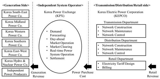 After generation competition in the Korean power industry was introduced in early 2000, the structure of the Korean power industry has been shaped as shown in Figure 1. There are now six major public generation companies with base-load generations and several independent power producers mostly with on-peak generations on the generation side. The Korea Electric Power Corporation (KEPCO) is a vertically integrated monopolistic public company that owns transmission, distribution, and the retail side. Additionally, the Korea Power Exchange (KPX) is an independent system operator in charge of the power market and system operations. The generation companies participate in the wholesale power market of KPX as sellers of electricity. KEPCO, district electric power companies, and other large industrial customers purchase electricity through the power market. Because the retail department of KEPCO purchases an estimated 97% of exchange volume in KPX’s power market, we can state KEPCO holds a monopolistic position on the demand side of the market. KEPCO’s retail rate of electricity is determined under Korean government regulations, considering economic growth, consumer protection, and other political factors. Therefore, it is rational to assume the changes in the cost of generation are not instantly reflected in retail rates.