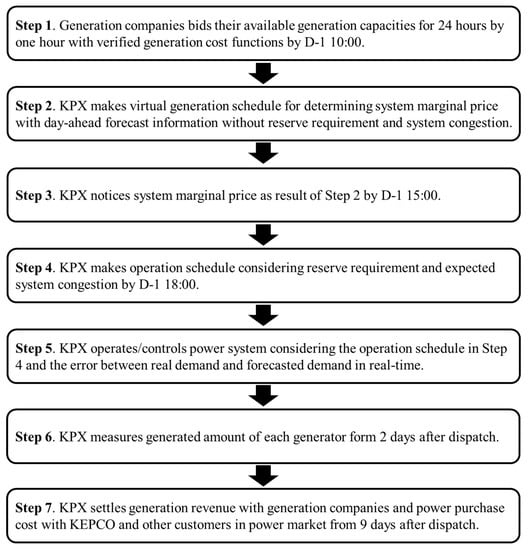 There is only a day-ahead market, operated by KPX, and the real-time system operation is conducted at the discretion of KPX instead of market mechanisms. The day-ahead market is operated according to a process based on cost-based pool (CBP) mechanisms as follows.
