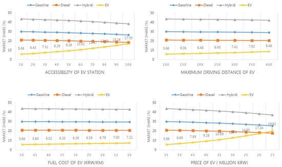 Additionally, we observe the change in the market share of electric vehicles according to the improvement of key attributes associated with these vehicles. The assumptions for improvement come from the experimental setups in similar studies [15,31]. Figure 3 shows how the market share of electric vehicles changes depending on accessibility of charging stations, and maximum driving distance, fuel cost, and price of electric vehicles.