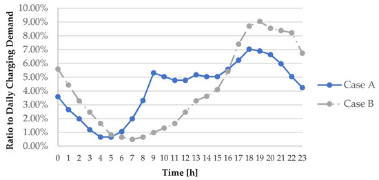 Figure 4. Charging demand profile of three cases [Unit: %]. Note: Case A, and Case B means “Charging at home, work, and commercial places” and “Home charging only,” respectively. Total charging demands are set to be equal in two cases.