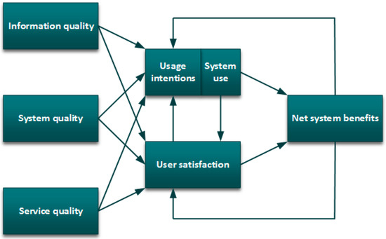 - Delone, W.H.; McLean, E.R. The DeLone and McLean model of information systems success: A ten-year update. J. Manag. Inf. Syst. 2003, 19, 9–30. [Google Scholar] [CrossRef]
