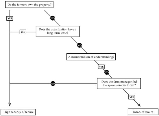 Farms were separated into two populations based on tenure status—high-security and low-security—and related to sixteen predictor variables (Table 1). Tenure status is a complicated issue, we have allowed for some simplification for the sake of analysis. This methodology may fail to capture the nuance of unique regional, local, and social and economic drivers that affect urban agriculture sites. Our methodology depended on legal land status and perception of farm managers regarding tenure insecurity (Figure 1). In some cases, farms that are owned by producers may still have insecure tenure status, but this sample did not identify any tenure insecure farms that had legal land ownership. In two instances, favorable farm manager perception combined with a memorandum of understanding (MOU) determined tenure status as secure. Both populations are equally represented within the sample: n = 27 (low security) and n = 29 (high security).