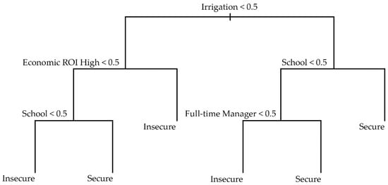Differentiating groups using a classification and regression tree (Figure 2) confirms findings from previous analysis and helps us understand what factors most likely predict secure tenure in measured farms. At each “branch” of the tree, a decision based on binomial (0,1) regression modeling is made, creating a hierarchical structure that maximizes the reduction in impurity. When the criteria are not met (0) the regression tree branches to the readers left, and when the condition is met (1), to the right. Ability to pay for irrigation, a proxy of economic support, was the most important factor in this analysis followed by school affiliation and the economic opportunity index “high” category.