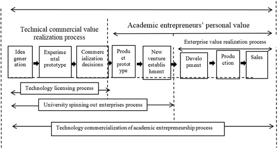 Louis (1989) described academic entrepreneurship as a commercialized activity involving technology developed in a university. As academic entrepreneurs, scholars develop research-oriented ideas or products, and bring them to market to promote the profit, influence, or reputation of individuals or institutions [11]. The commercialization of university technology is the beginning of technological innovation [3]. It is a process committed to achieving the market value [12] of technical know-how, technical knowledge, or technology developed within the university [13].