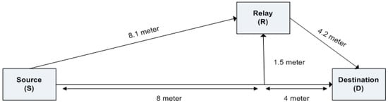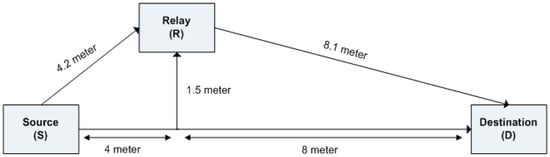 At position ‘A’ relay is placed near to the source and away from the destination, as shown in Figure 2. The distances from source to destination, source to relay, and relay to destination are 12 m, 4.2 m, and 8.1 m, respectively.
