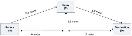 At position ‘B’, relay is placed at equally distance from source and destination, as shown in Figure 3. The distances from source to the destination, source to relay and relay to destination are 12 m, 6.2 m, and 6.2 m, respectively.