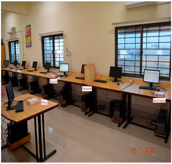 In setup 2, as shown in Figure 6, a wooden obstacle of 60 × 45 × 1.5 cm dimension is placed between the source and the destination. No obstacle is placed in the relay destination path.