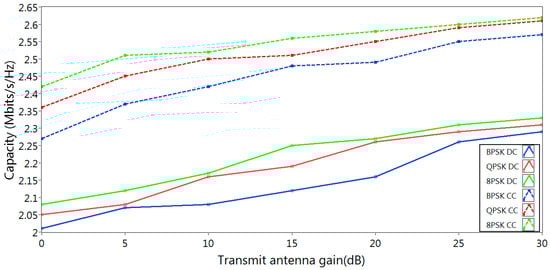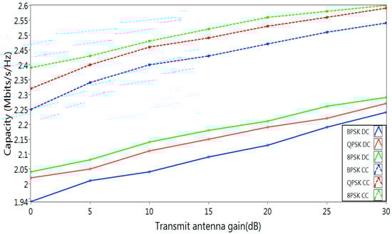 Figure 7 shows the experimental results of DC and CC without any obstacle. The performance of CC dominates the DC. From Table 3, the average channel capacity gain of CC over DC is 14.44% for BPSK, 14.59% for QPSK, and 14.75% for 8PSK, respectively.