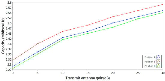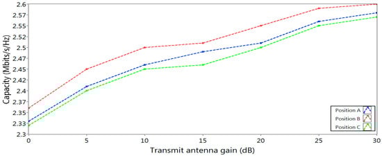 In this setup, when the obstacle is introduced between source and destination, performance is analyzed for all three position A, B, and C. Capacity gain is calculated for all the above three cases. In Figure 10 shows the results of evaluation for the optimal position of the relay with obstacle. The relay position at B performance is better than A and C. While the relay position at A performance is better than C. From Table 6, the average capacity gain of relay position at B is 1.22% and 1.70% over A and C. On the other hand, the average capacity gain of relay position at A is 0.47% over B position.