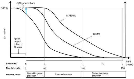 Anything before t0 is the past, while anything afterwards is the future. The original cohort in this illustrative case is imagined to be 40 years old, and from the survival function S(original cohort) we can see that the first rehabilitation was done about 25 years ago. The first incline of the survival function illustrates this first rehabilitation. These values are given as examples for illustrative purposes and are not used in the analysis.